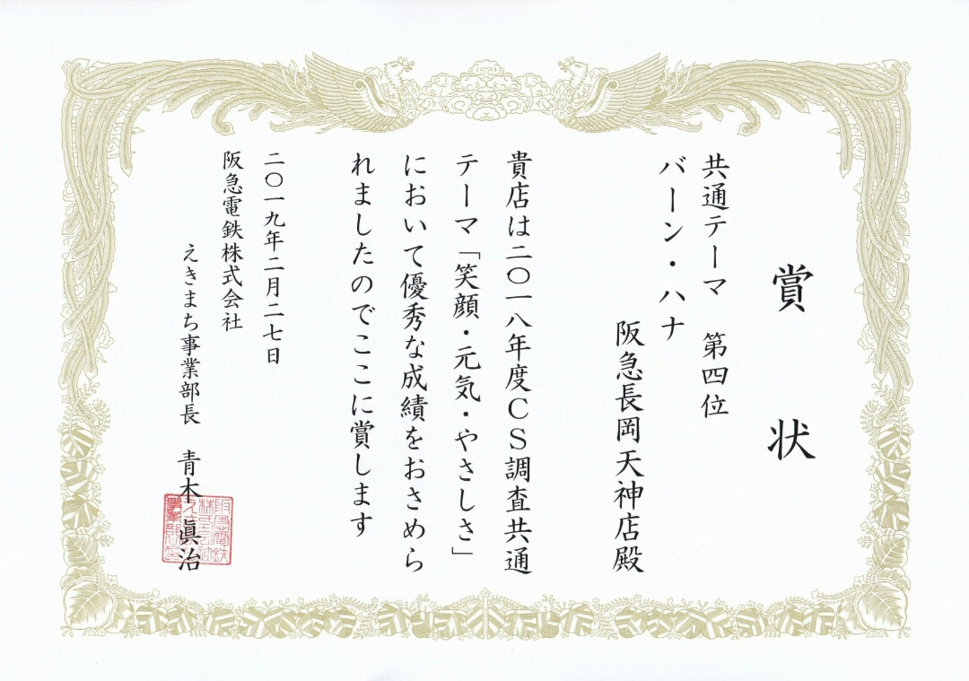 2019年2月27日 / 最終更新日 : 2019年2月27日 鵜川和久 阪急長岡天神バーンハナ 本日、阪急阪神リテールズ2018年CS調査フィードバック講習会が有りました。 長岡天神店は調査結果、共通テーマの【笑顔、、元気、やさしさ】において全308店舗中、 堂々の第四位にランクインし表彰されました❗ 昨年は同業態六店舗中、 最下位 と悔しい結果でしたが今回は同業態では一位ですぞよ~~☺ 皆さんの頑張りが評価され非常に嬉しく思います。有り難うございます‼️ これからも愛され続けるお店を継続していきましょ🎵